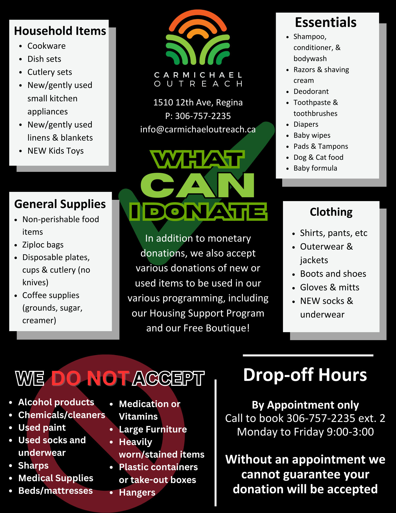 Where and when: Carmichael Outreach, donation door (west side of building), located at 1510 12th Avenue. Call reception to book an appointment Monday through Friday between 9:00am and 3:30pm. If unable to make an appointment call in advance to see if we’re accepting donations for that day.